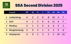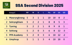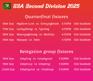 Shillong, Sep 13: The last of the group stage matches of the Shillong Sports Association’s Second Division 2025 were held today, with Marbisu defeating Umphrynai 3-0, while Mawryngkneng beat Umphrup 3-1.