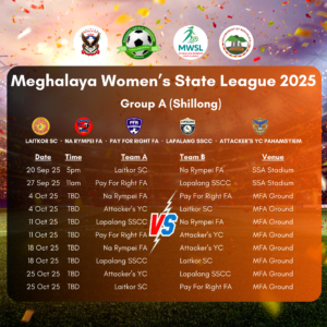 Laitkor SC, Na Rympei FA, Pay For Right Football Academy (SSA runners-up), Lapalang SSCC (Riwar Mihngi Football Association runners-up) and Attacker’s Youth Club Pahamsyiem (RBDSA runners-up) form Group A. Their matches will take place at the SSA Stadium and the adjacent MFA Ground.
