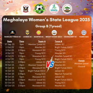 Group B consists of six teams – Mawlum Tyrsad SC (Tyrsad Area Sports Association champions), Jakrem SC (Mawkyrwat District Sports Association champions), Young SSCC (Pyndengumiong District Sports Association champions), Mawten SC (MDSA runners-up), Bright Future SSCC (PDSA runners-up) and Mawsawrit SC (TASA runners-up). Their matches will take place in Mawlum Tyrsad Ground.
