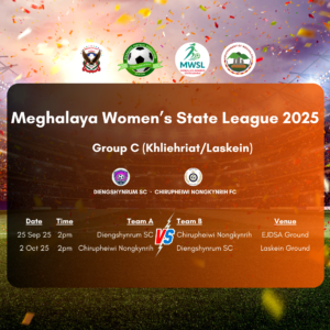 Group C has just two entrants from Jaintia Hills – Diengshynrum SC (East Jaintia Hills District Football Association champions) and Chirupheiwi Nongkynrih FC (Laskein Block Sports Association champions). As there are only two teams, they will play each other twice, home and away.