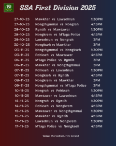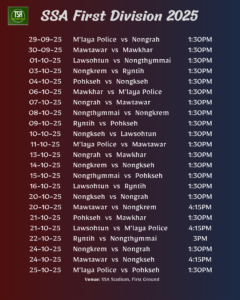 Shillong, Sep 22: The Shillong Sports Association’s First Division 2025 will begin on 29th September with 10 teams vying for the title and ultimately promotion to next season’s Shillong Premier League.