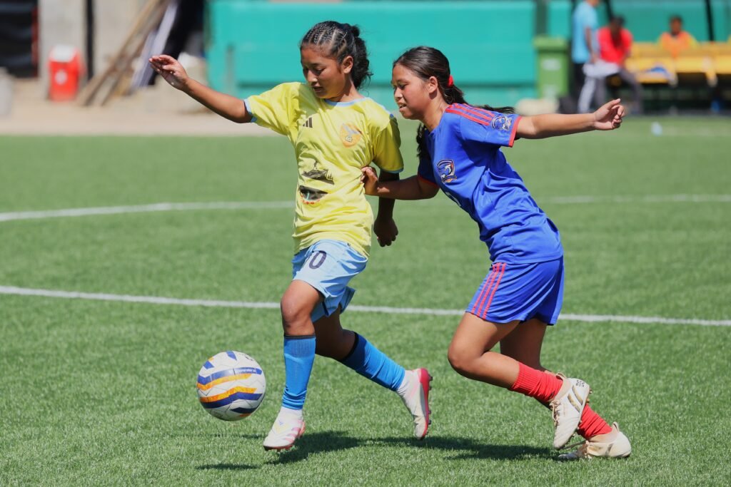 (Meghalaya Football Association photo. Pynibha Rangthaluh of Attacker’s YC (left) in action against a player of Na Rympei FA)